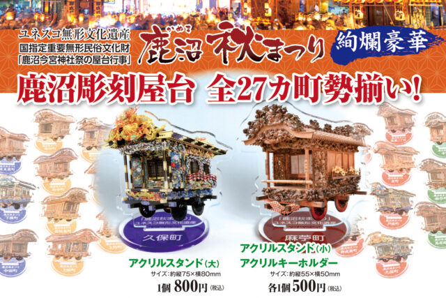 持続可能な開発目標(SDGs)に ユネスコ無形文化遺産「鹿沼秋まつり」の保護・保全の為に広報活動があります。 その一環といたしまして鹿沼彫刻屋台のアクリルスタンド、アクリルキーホルダーを 制作・販売致しております。 観光 […]